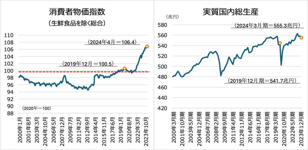 では、実体経済はどのように推移してきたのであろうか。この一年で光熱費や食費の値上げのニュースなどでインフレを実感している人も多くいるだろう。消費者物価指数(生鮮食品を除く総合)は、コロナ禍前の2019年12月時点で100.5だったのに対し、2024年4月時点では106.4と約6pt上昇している。コロナ禍前の日本は長期に渡って物価変動が小さかったため、足元で急速に高まっているインフレ傾向を過去に経験している人が少なく、このままインフレ傾向が継続したときにどのような影響が出るのか、想像することが難しいと多くの人が感じているだろう。また、実質GDPはコロナ禍直後に大きく落ち込んだ分を足元では既に取り戻しており、2019年12月期の541.7兆円と比べて、2024年3月期は555.3兆円と2.5%増加している。一方で、2023年の実質賃金はマイナスで推移しており、消費動向や住宅の賃料などに少なからぬ影響を与えることから、今後の動向が注目される。