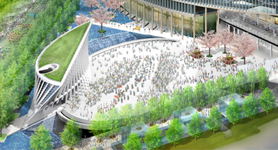 - 大阪駅北口の正面には、デザイン監修として建築家安藤忠雄氏も参画する約10,000 ㎡の「大阪北口広場」を整備します。これからの大阪を象徴する新しいシンボル空間を形成します。
